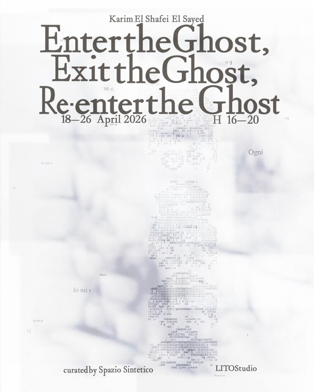 Karim El Shafei El Sayed's exhibition Enter the Ghost, exit the Ghost, re-enter the Ghost explores the figure of the specter as a presence that inhabits the fracture between the “no longer” and the “not yet.” Through installations, automatic writing, an urban model, and a pamphlet with a contradictory narrative, the project stages denied and continuously re-emerging possibilities. Language, space, and sensory experience construct a structural suspension that invites us to cross over into what, although not fully present, continues to act in reality.