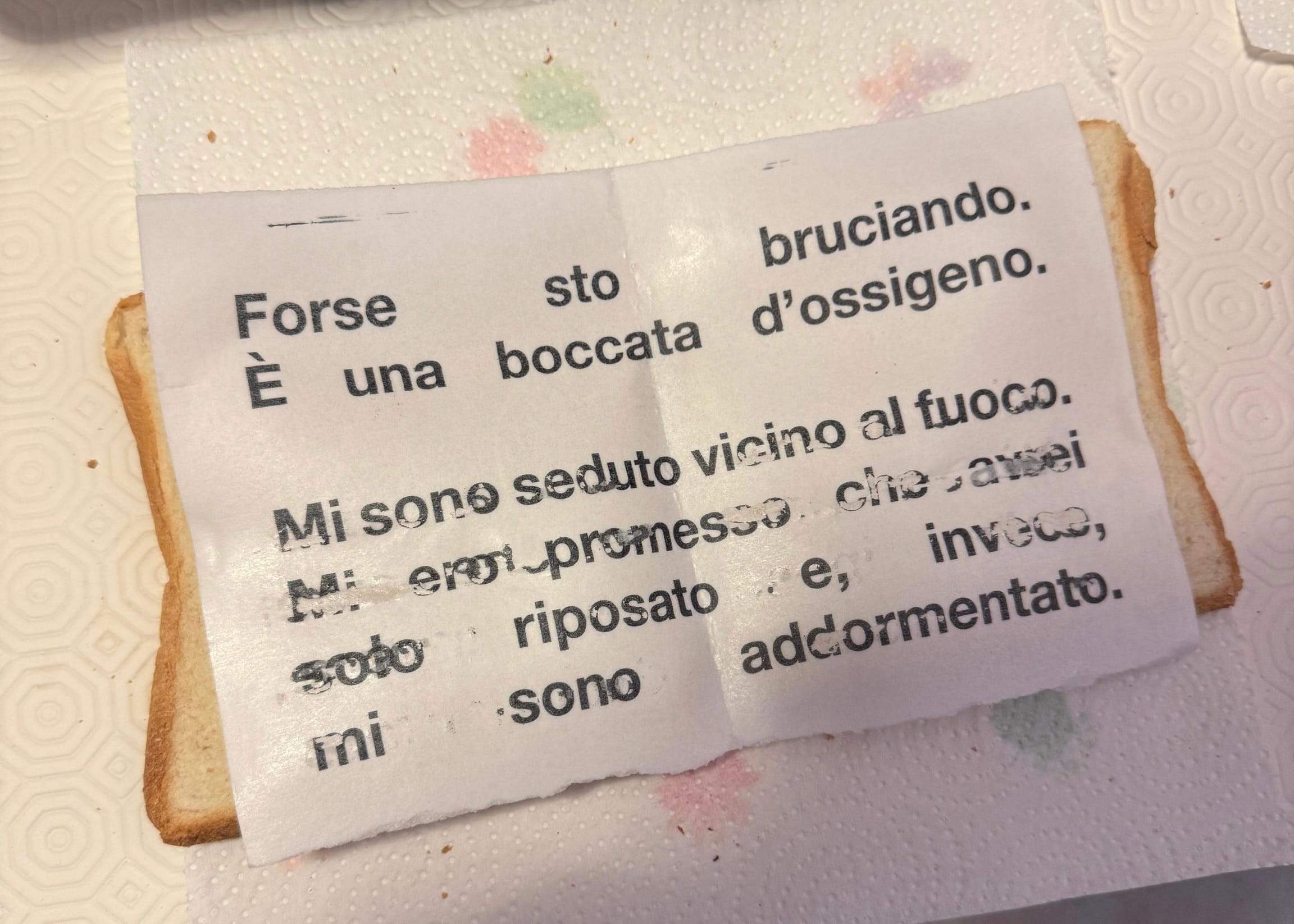 The work explores the relationship between existential emptiness, memory, and personal storytelling, addressing the difficulty of shaping a thought marked by contradiction. It emerges from the conflict between the urge to express discomfort and the awareness of its possible futility. From this sense of disorientation arises a participatory action: a personal narrative is printed with an edible printer and placed between two slices of bread, becoming an edible toast. The act of eating becomes a metaphor for emotional digestion to process lived experience. The work also reflects on the acceleration of emotional processes and the commodification of personal experiences, simulating the sale of the toasts as a commentary on a present in which life is increasingly displayed and monetized.