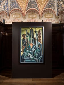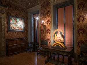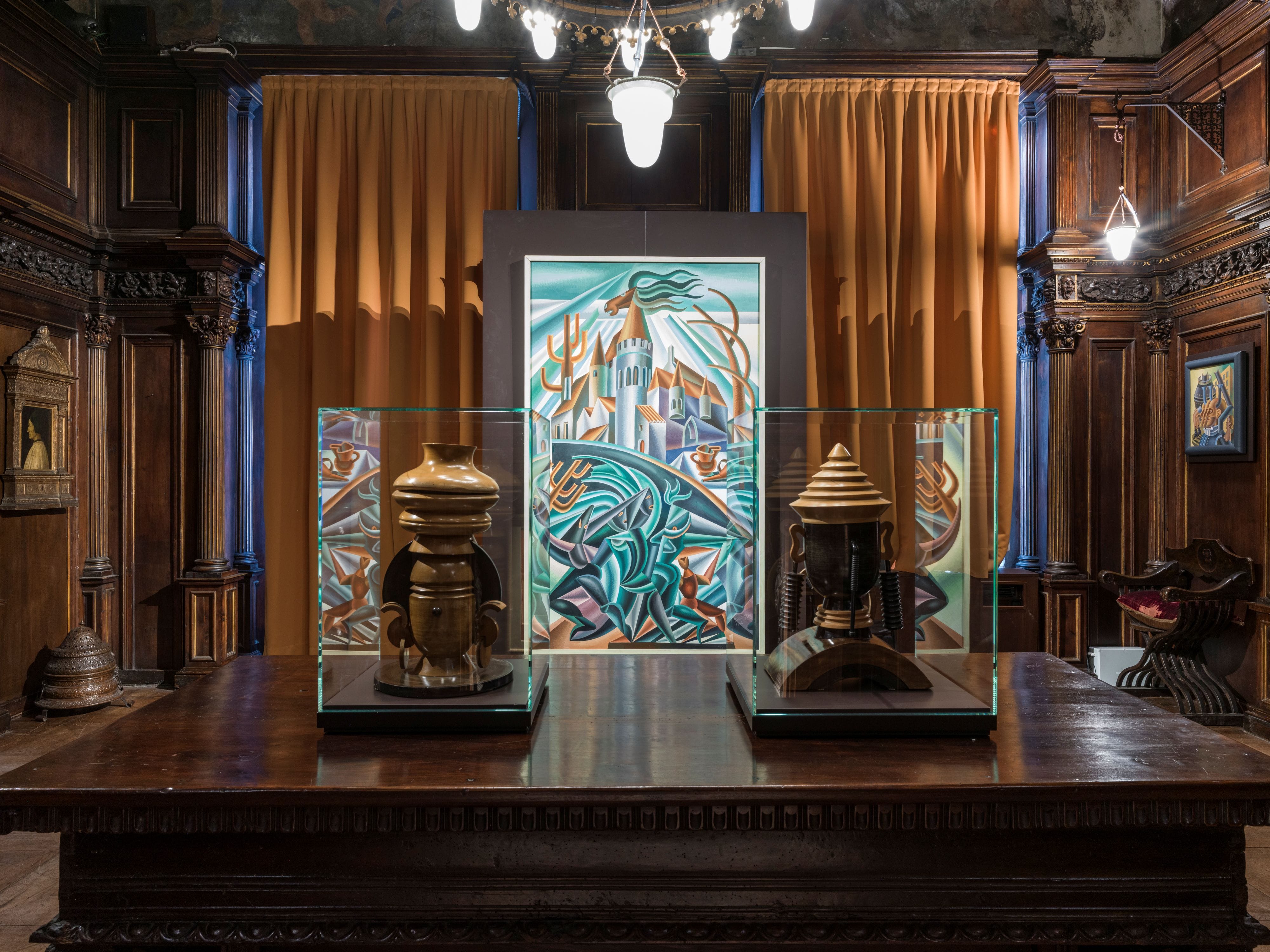 Nell’ambiente neorinascimentale della casa museo, le sale diventano meccanismi teatrali che accolgono la ricerca tardo futurista di Depero, integrandola e raccontandola.